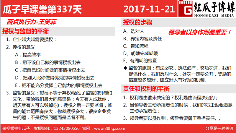 3、監督的意義:授權不等于棄權(犧牲了監督的機制和文化,帶給我們最大的惡果是:今天有人成就你,明天就有人可以毀掉你),授權之后一定要監督,監督的能力范圍有多大,你就授權多大,很多企業發生問題,不是授權問題而是監督不利。