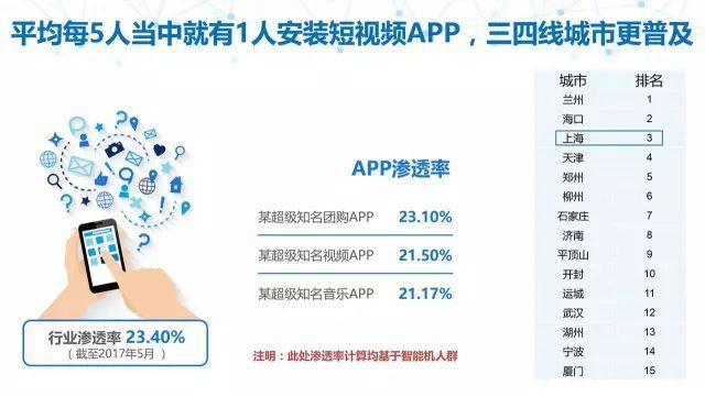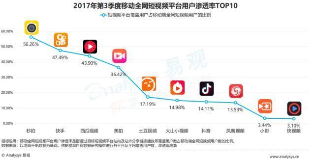 2017年第3季度移動(dòng)全網(wǎng)短視頻平臺(tái)根據(jù)用戶(hù)滲透率分為三個(gè)梯隊(duì):