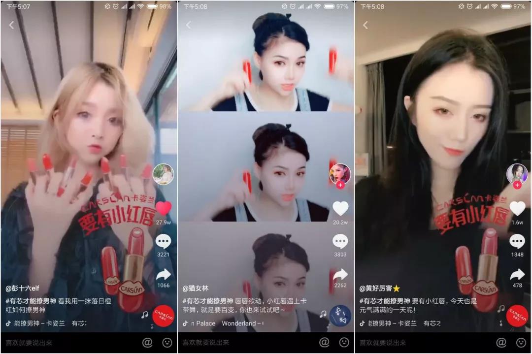 憑此亮眼數(shù)據(jù),卡姿蘭#有芯才能撩男神#挑戰(zhàn)賽強(qiáng)勢占據(jù)美妝行業(yè)商業(yè)化挑戰(zhàn)賽第一名。“小紅唇”唇膏一夜爆紅,成為新一代抖音好物。