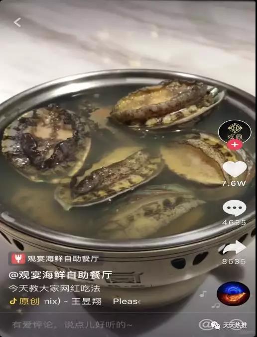 我們根據“觀宴”的實際情況和顧客的行為習慣及愛好,也設計了一出鮑魚網紅吃法的視頻,視頻一經發出點贊量達到7.6萬,評論達到4655+。