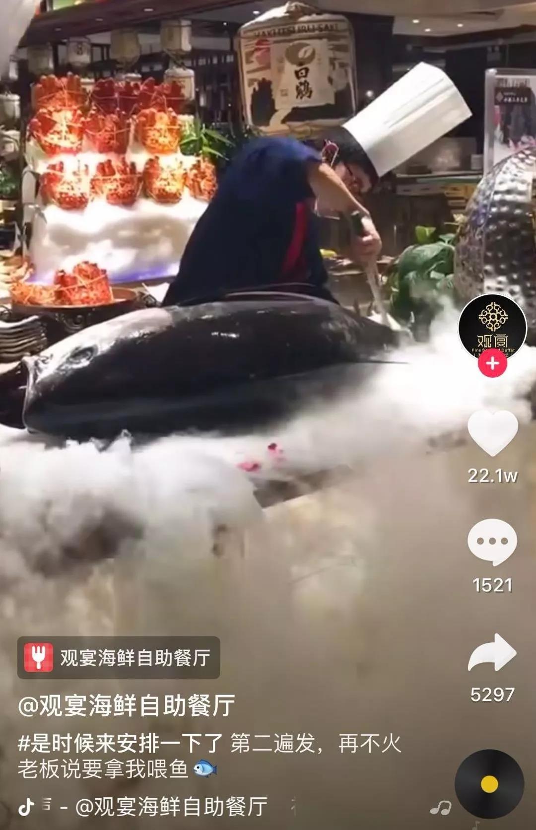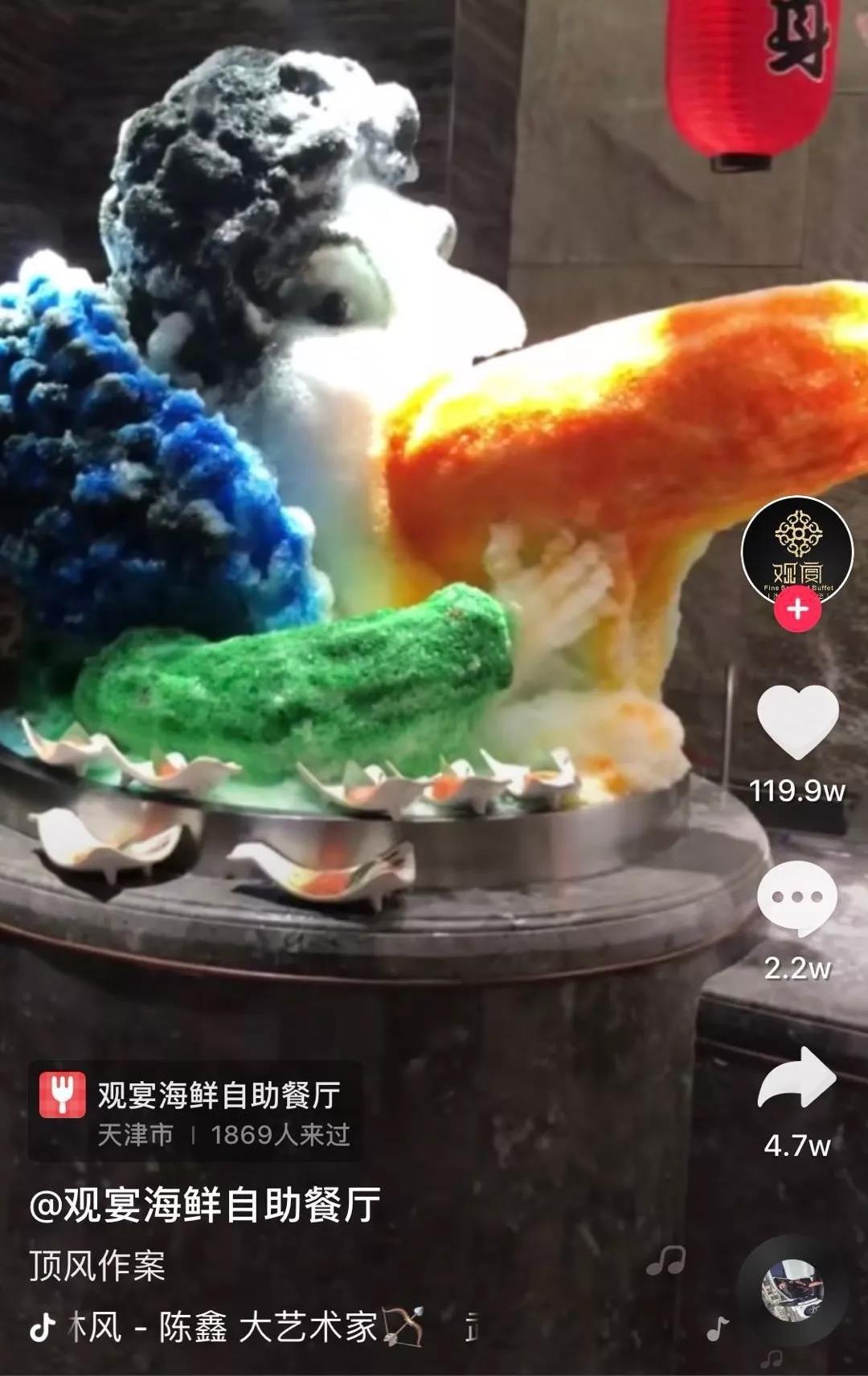 每過一段時間抖音就會流出一批“神曲”、流行場景的爆火視頻,我們制定了蹭熱點方案,用抖音上的熱門音頻、熱門拍攝手法、近期熱點進行拍攝,為“觀宴”策劃用冰雕制作熱點形象的視頻。